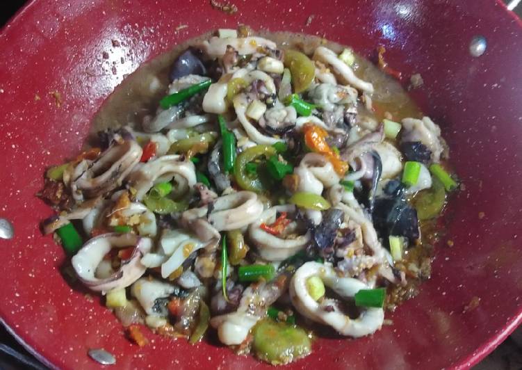 - Siapkan bumbu uleg, bawang merah, putih, kemiri, cabe rawit. Uleg smpe halus, kalo sdh, potong2 daun bawang dan tomat hijaux. Semua siap saatx memasak, siapkn wajan isi minyak goreng secukupx, tumis bumbu uleg td smpe harum, kalo sdh masukan cumi, kalo cumix sdh mulai stengah mateng masukan tomat n daun bawang, tunggu smpe mateng tdk perlu terlalu lama, masukan garam, penyedap, merica n saos tiram. Tes rasa, kalo sdh siap di sajikan mkn dengan nasi panas..