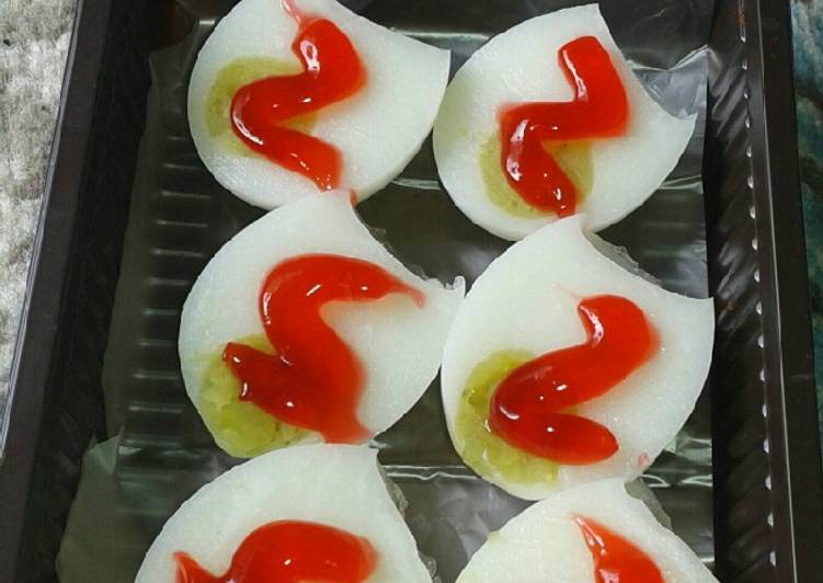 - Setelah dingin kupas kulit telur, belah 2 dan beri toping strawberry.